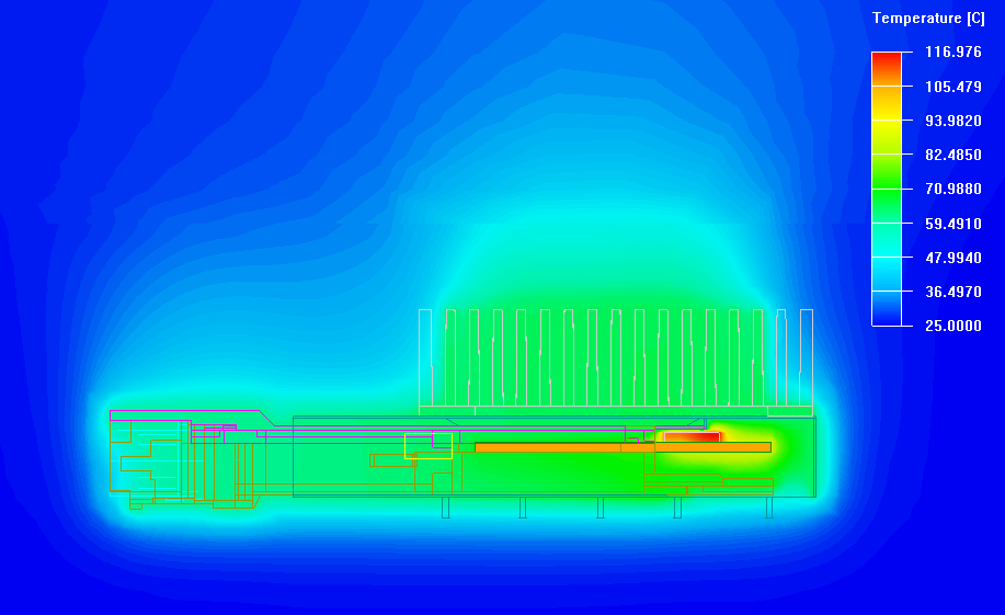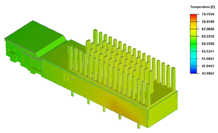 (QSFP-DD在熱模擬中,溫度的發熱情形)